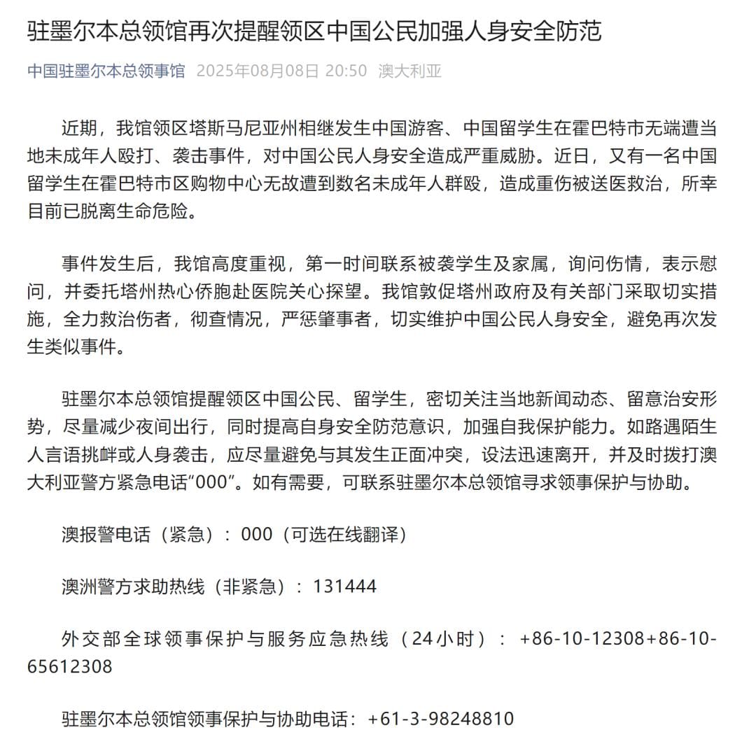 🌐 The Consulate has also appealed to the Tasmanian government to implement effective actions to protect the safety of Chinese nationals, ensure thorough investigations, and prevent future attacks. These calls reflect broader unease about the well-being of international students and tourists in Australia.