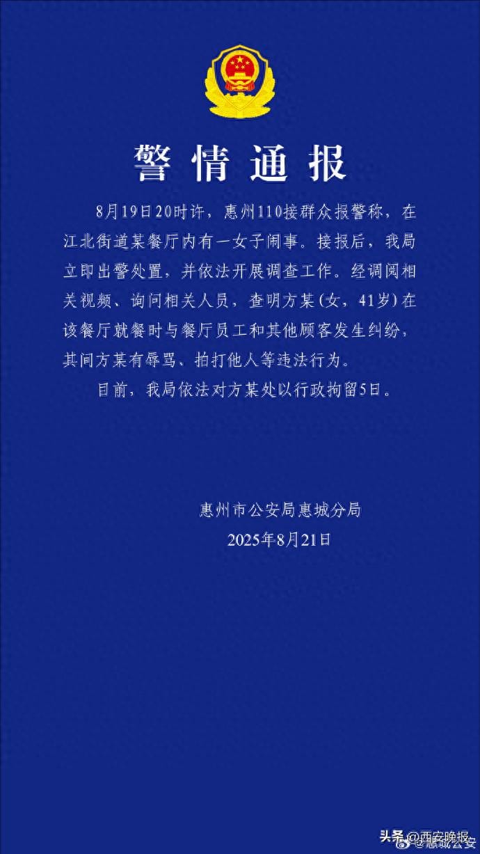 A 41-year-old woman disrupted a McDonald's in Huizhou, verbally abusing staff and customers, leading to her detention and compensation for injured staff.